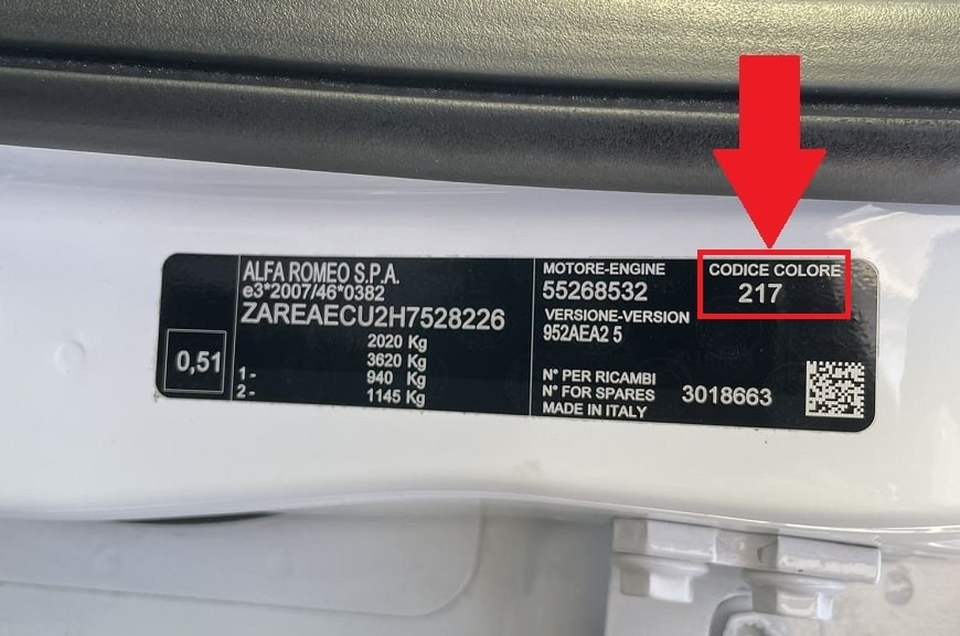 Aquí es donde se sitúa el código de color de la marca Alfa Romeo: Por lo general hay que mirar dentro de la puerta del conductor. Puede encontrar la placa allí, con el código de color generalmente ubicado en la esquina superior derecha junto a “código de color”.