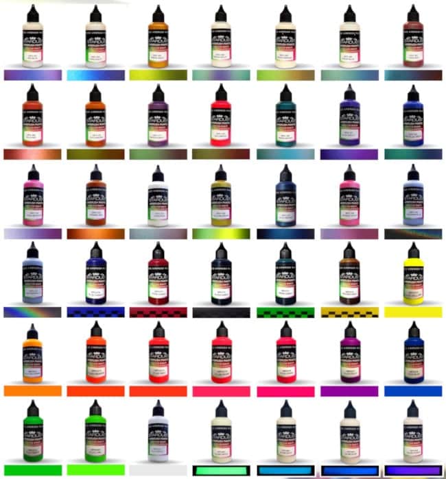 La mayoría de las pinturas especiales o de efectos especiales se pueden trasladar a una Versión pintura para aerógrafo, tanto en fase acuosa como en fase disolvente. Las pinturas de aerógrafo a base de agua siempre tardan un poco más en secarse, en comparación con las pinturas de aerógrafo a base de solventes. Sin embargo, el efecto final es similar, y por supuesto la aplicación es mucho más agradable cuando no hay olores nocivos.