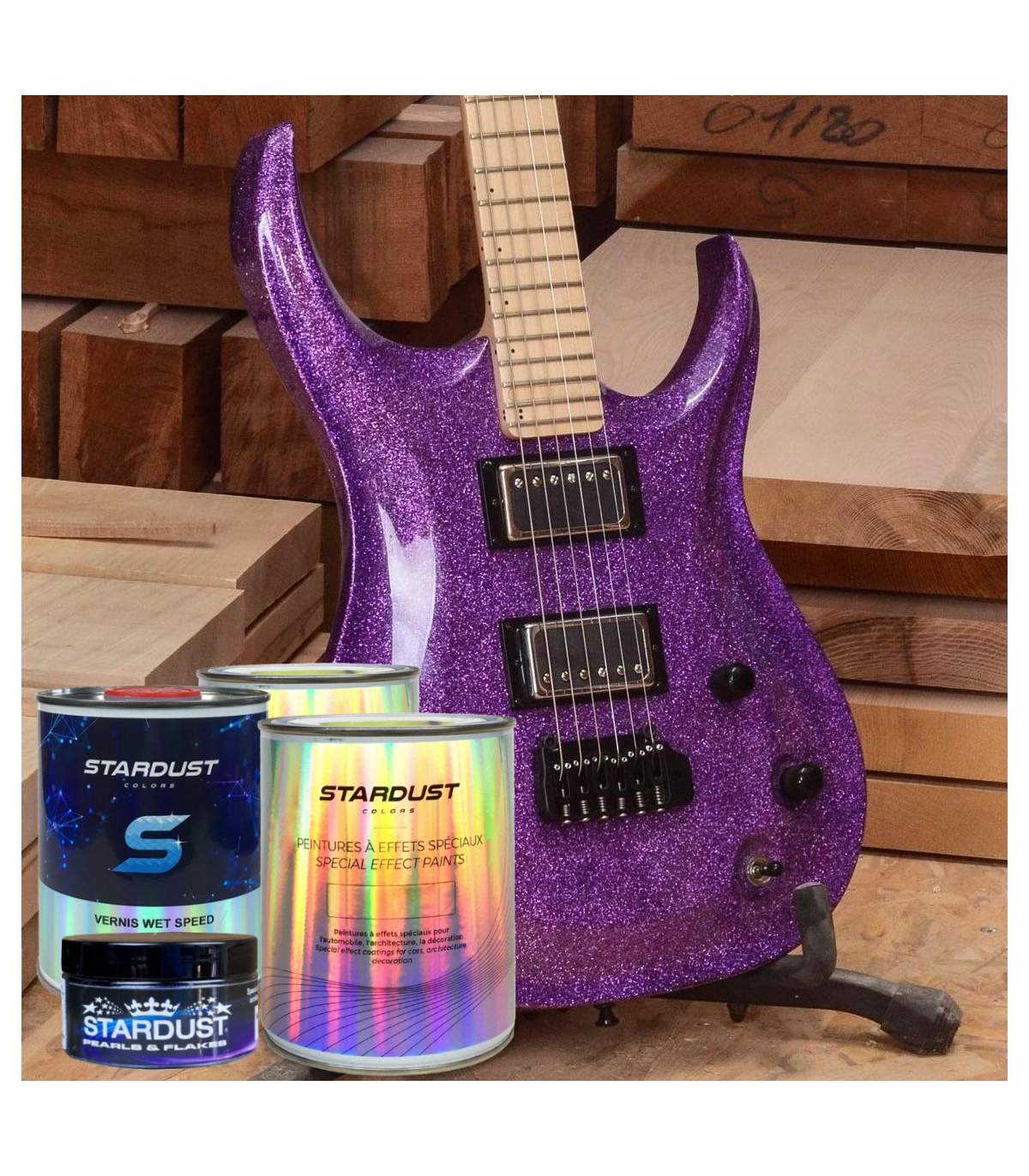 El kit completo de pintura con efecto purpurina para guitarra incluye todos los productos para realizar un acabado de purpurina METAL FLAKES con el color a elegir. El kit no incluye la imprimación*.
