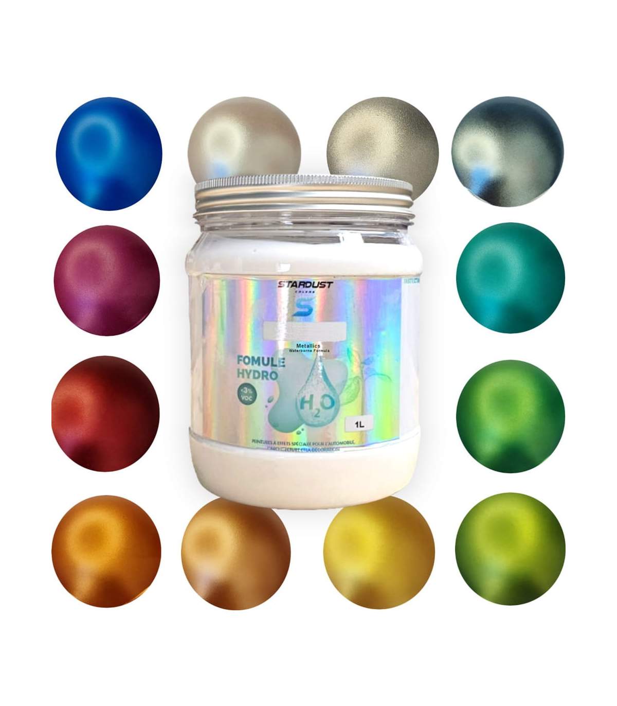 Las pinturas Hydro metalizadas ofrecen una amplia gama de tonalidades con reflejos iridiscentes y metálicos, con los clásicos colores naturales de oro, cobre, aluminio y bronce, pero también una serie de colores variados, brillantes y chispeantes, formulados con pigmentos de aluminio o nácar, y una serie de colores iridiscentes transparentes (GHOST).